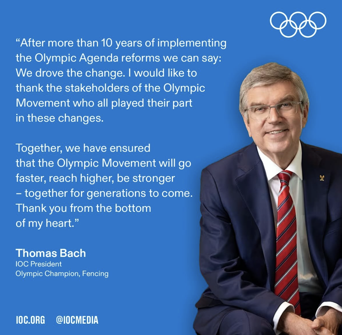 El proceso, lanzado bajo el lema “Cambiar o ser cambiado” y con la consulta más amplia de la historia, el movimiento iniciado por Thomas Bach fue aprobado por unanimidad en la 127ª Sesión del COI, celebrada en Mónaco en diciembre de 2014.