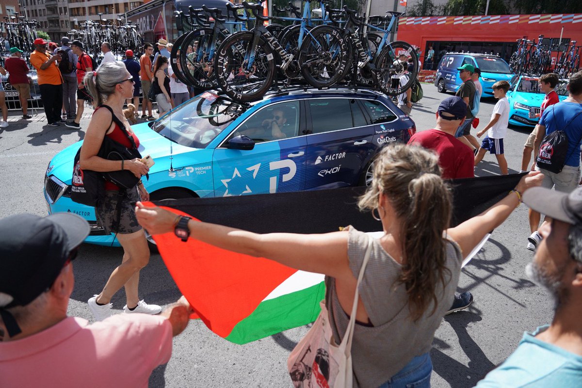 El pasado martes, al paso por la localidad navarra de Lumbier (norte), varias personas trataron de parar el pelotón, aunque finalmente no lo lograron. Y durante varias etapas se han visto innumerables banderas palestinas y pintadas en la carretera a lo largo del recorrido.