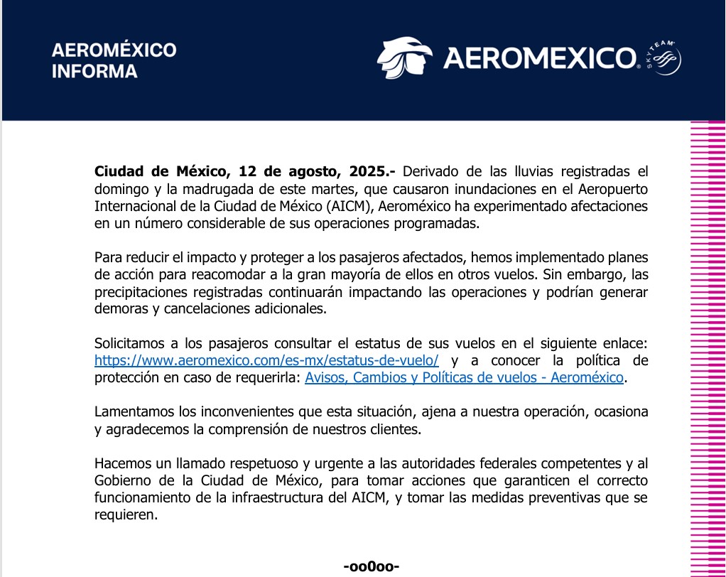 Aeroméxico manifestó que ha sufrido “afectaciones en un número considerable de sus operaciones” y que está reacomodando a la mayoría de los pasajeros afectados. También advirtió que las lluvias seguirán afectando las operaciones y pidió a los viajeros consultar el estatus de sus vuelos y sus políticas de protección.