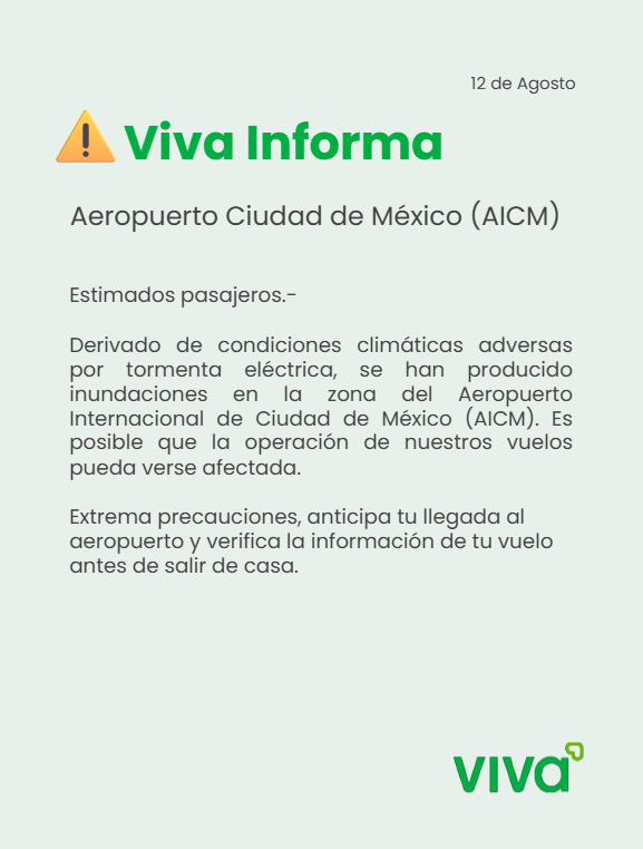 Viva Aerobus emitió un comunicado alertando sobre las condiciones adversas y solicitando a los pasajeros “extremar precauciones, anticipar su llegada y verificar la información de sus vuelos antes de salir de casa”.